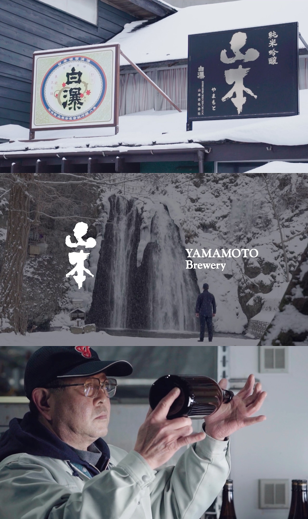 Yamamoto Shuzo, a sake brewery located in Happo Town, Akita Prefecture. Centered on the sake-brewing process, the film weaves in the atmosphere of the makers and the distinctive winter scenery of Japan’s Sea of Japan coast. With an eye toward an international audience, the piece was crafted with the sharp, refined edge embodied by Yamamoto Pure Black.